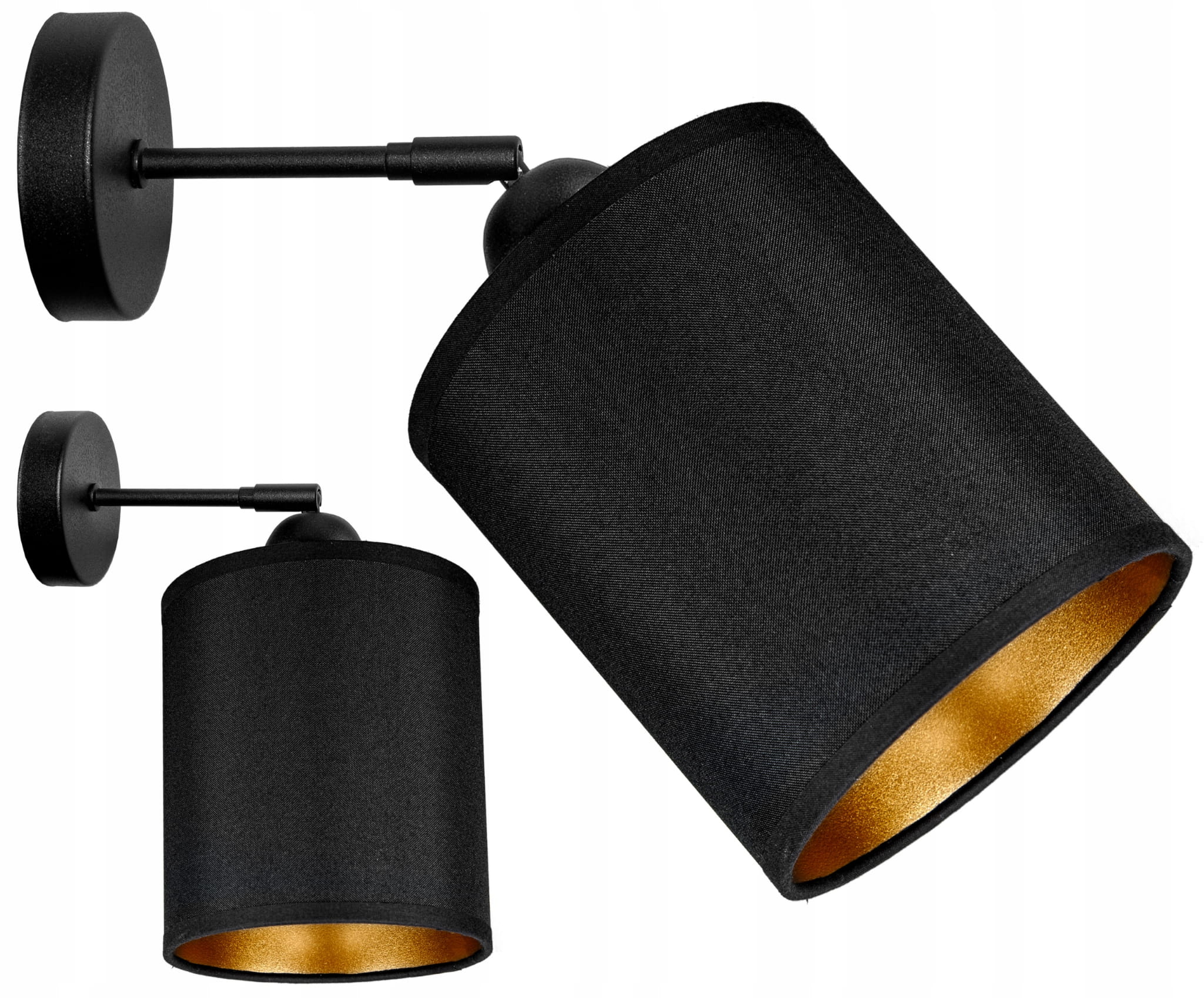 KINKIET TUBA LOFT BLACK abażur czarny to eleganckie oświetlenie boczne z kloszem abażurem ze złotym środkiem. Tkanina abażuru jest lekko mieniąca się. Ramionko kinkietu jest ustawne na przegubie dzięki temu można nakierować świecenie światła.
