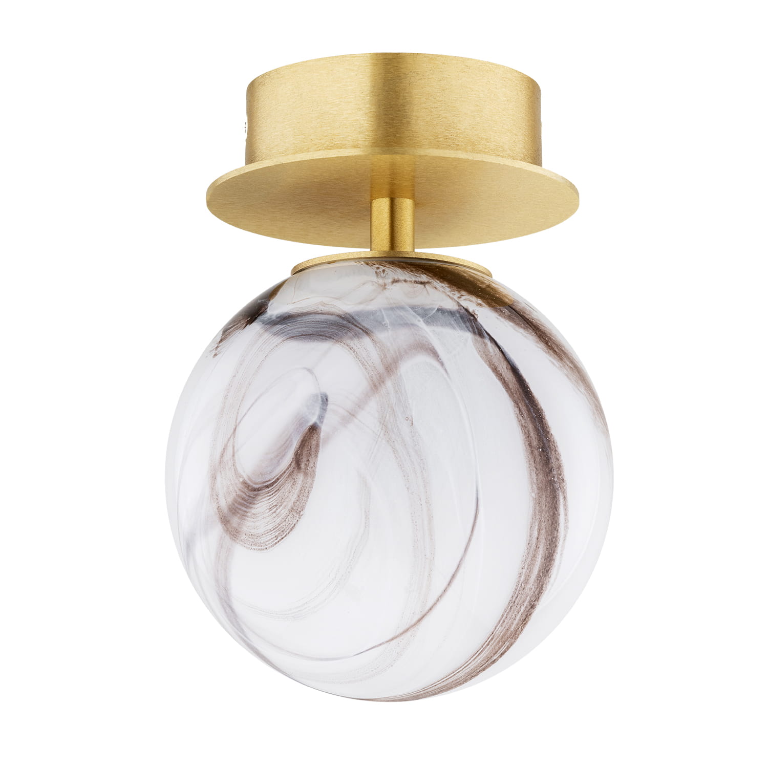Kompaktowy plafon łazienkowy 1-płomienny z marmurkowym kloszem i detalami w kolorze szczotkowanego mosiądzu. Idealny do małych łazienek, toalet lub jako dodatkowe oświetlenie strefy lustra. Dzięki klasie szczelności IP44 oprawa nadaje się do użytku w pomieszczeniach narażonych na wilgoć.