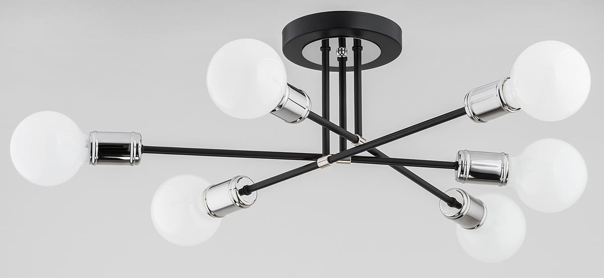 Lampa sufitowa czarna chrom TOLEDO Alfa to duża, nowoczesna oprawa oświetleniowa w modnych kolorach. Brak kloszy umożliwia montaż designerskich żarówek, które same w sobie stają się ozdobą wnętrza. Jej minimalistyczny i industrialny wygląd doskonale wpisuje się w współczesne aranżacje wnętrz.