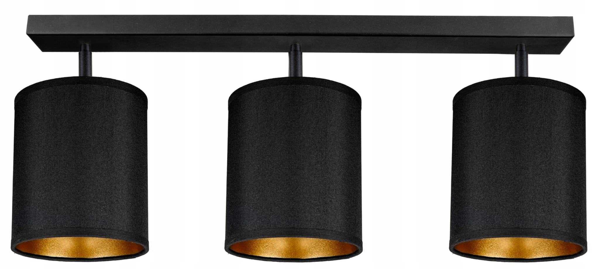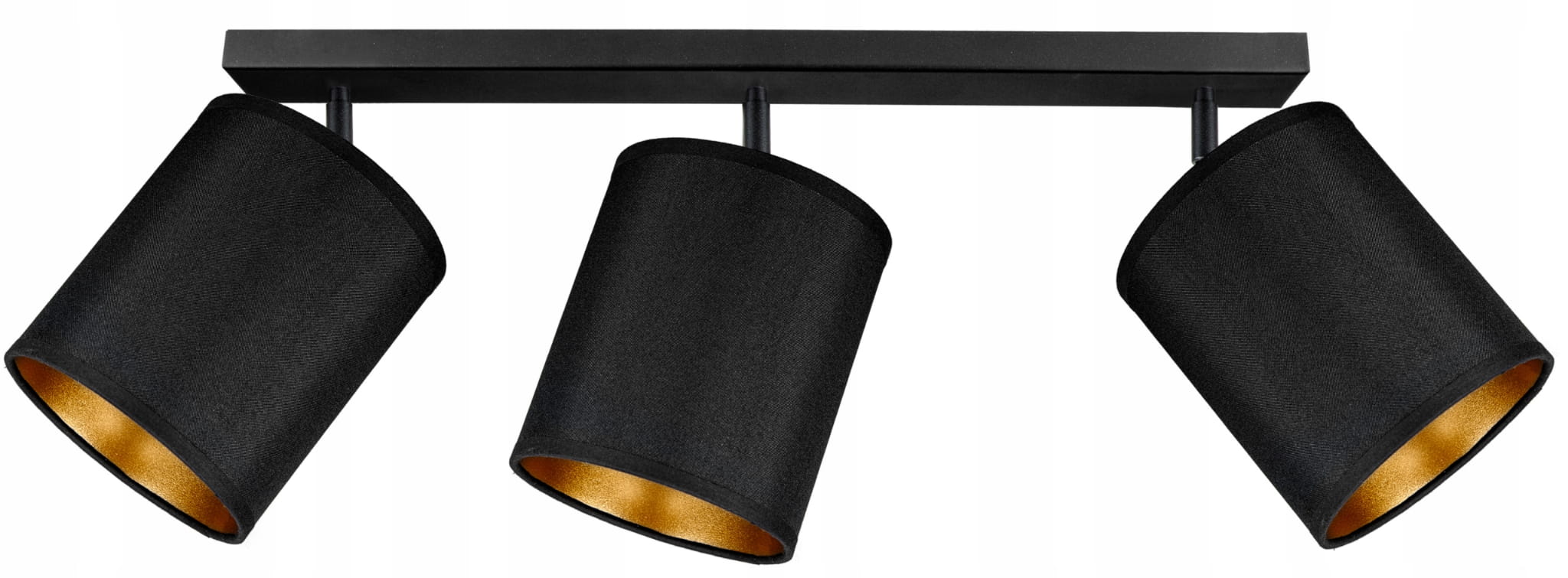 Lampa sufitowa SPOT na 3 czarne abażury ze złotymi środkami świetnie sprawdzi się w połączeniu z innymi lampami z tej samej serii oraz niezależnie jako oświetlenie mieszkania. Klosze są ustawne na przegubach pod kątem świecenia.