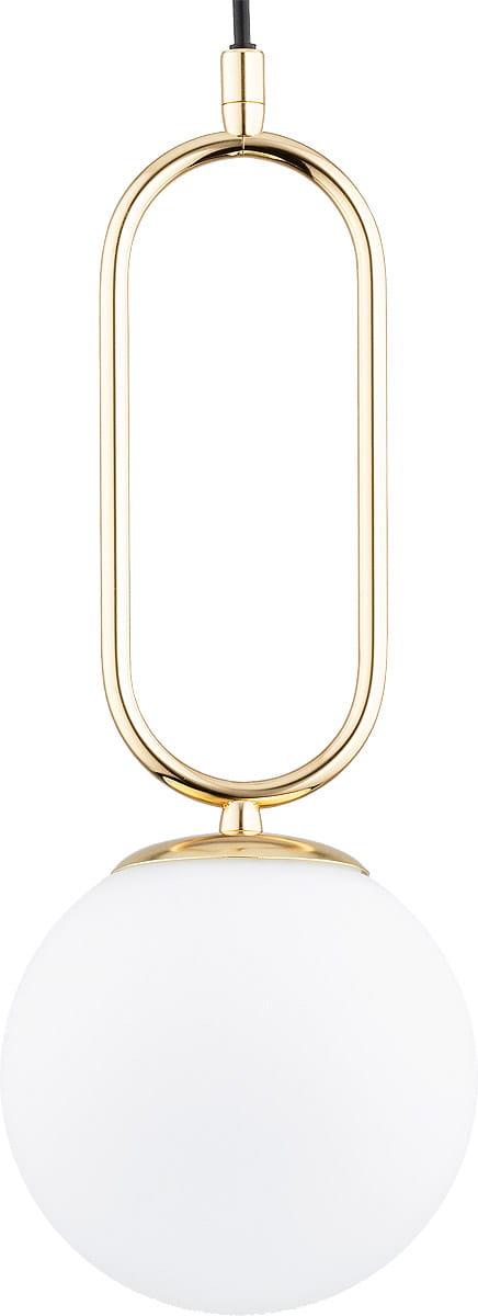 - Konstrukcja: Lampa składa się z jednego punktu świetlnego z białym kloszem w kształcie kulki o średnicy 15 cm, osadzonym na złotym stelażu z owalną obręczą.