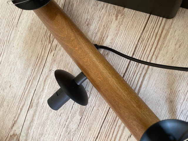 - Metalowe elementy: Czarny stelaż z elementami drewnianymi nadaje lampie nowoczesny i elegancki wygląd.