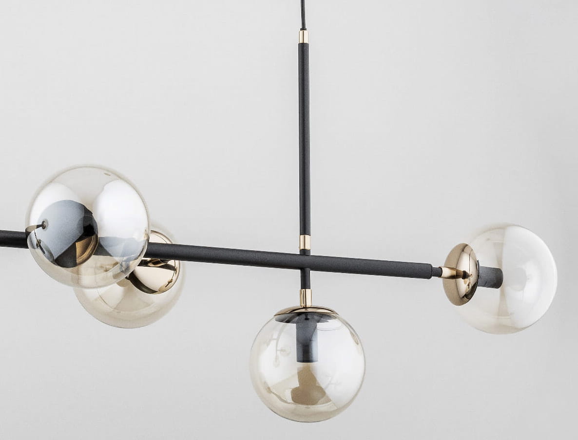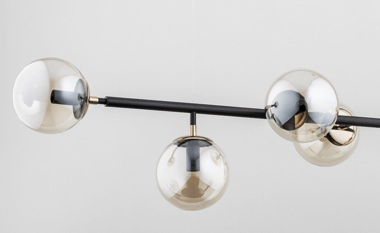 - Bursztynowe klosze: Szklane klosze w kształcie kulek w kolorze bursztynowym dodają ciepła i elegancji, tworząc przyjemne, rozproszone światło.