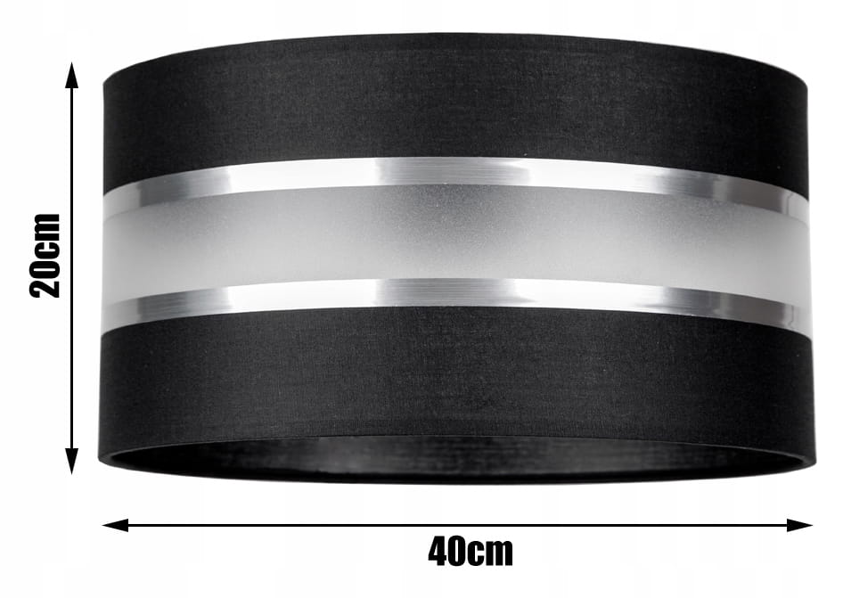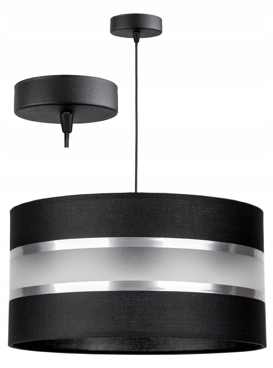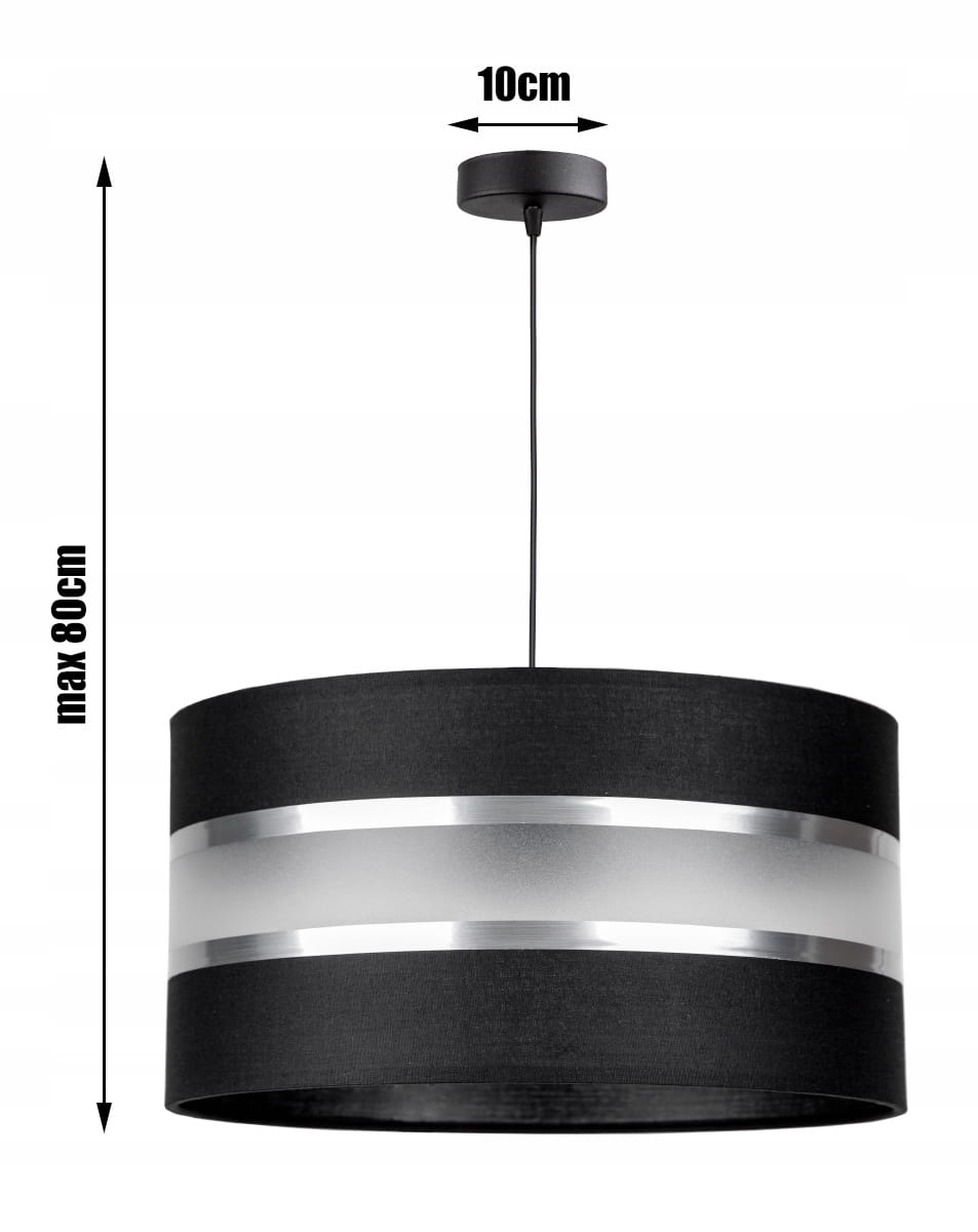 Lampa posiada abażur uszyty z gładniej czarnej tkaniny podbitej folią pcv w matowym kolorze z dodatkiem srebrnych pasów we wzorze.