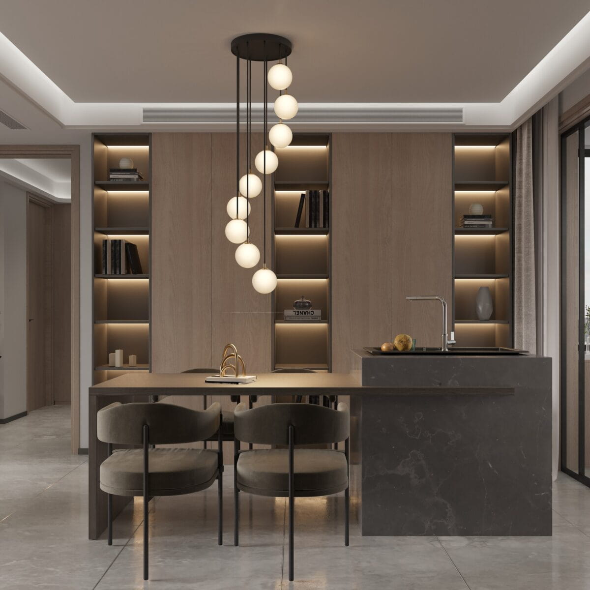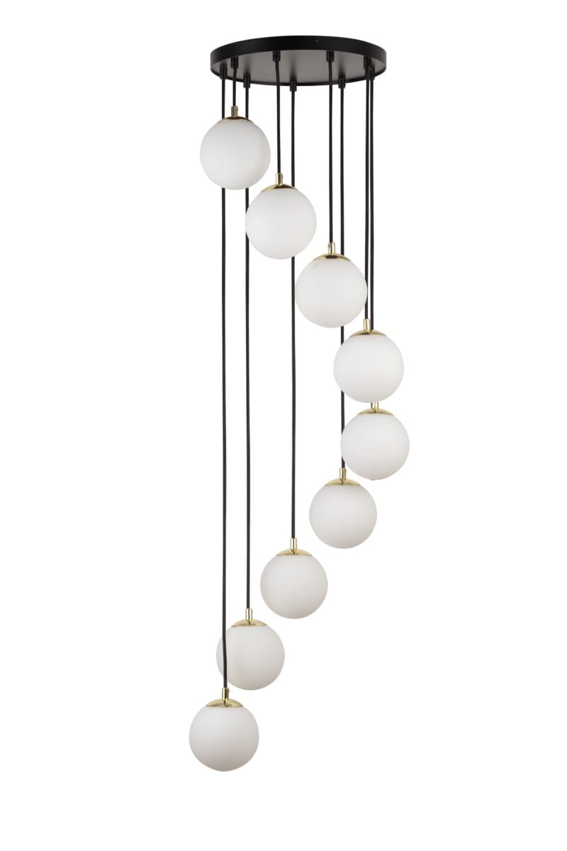 Lampa wisząca PIANO GOLD BLACK KULE 33239 Sigma to oprawa sufitowa bardzo okazała. Można ją zamontować na górnym piętrze nad schodami wówczas efekt kaskadowo zawieszonych 9 kloszy kulek będzie imponujący.