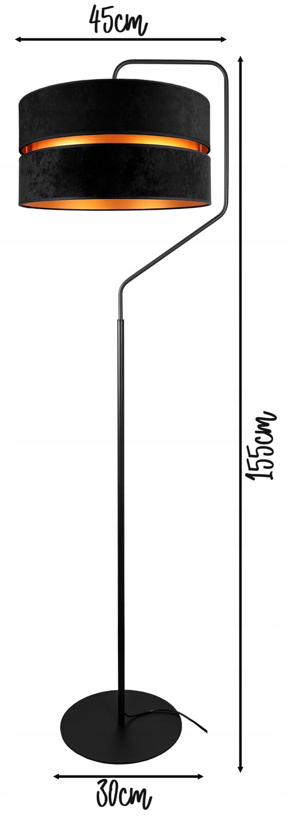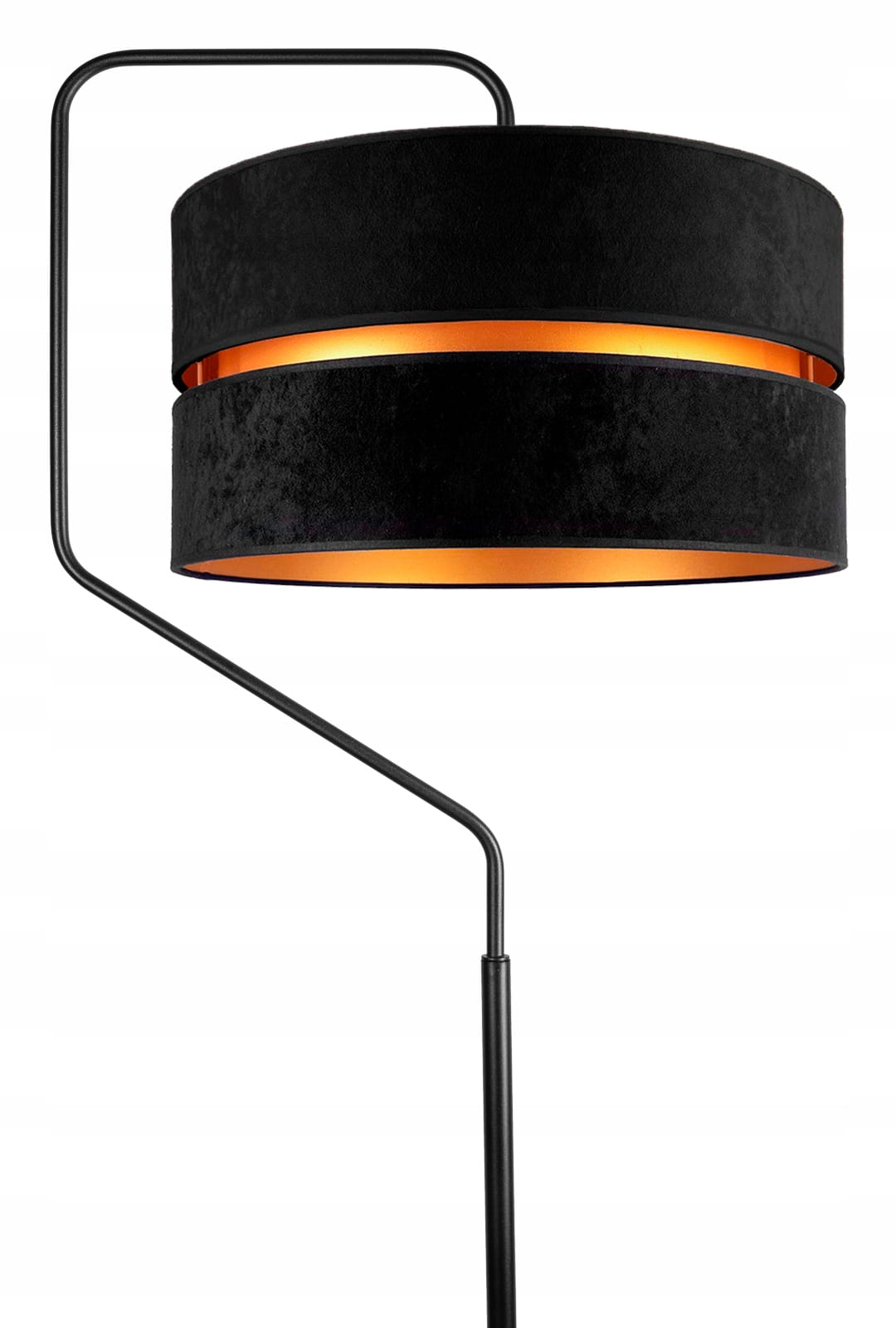 Nowoczesna lampa stojąca w stylu LOFT doskonale prezentuje się we wnętrzach klasycznych i industrialnych. Posiada elegancki welurowy podwójny abażur w modnym czarnym kolorze od słodu w złotym kolorze.
