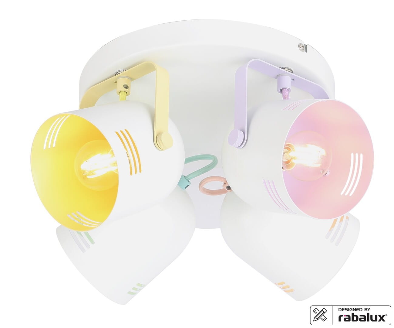 Wykonany z metalu poczwórny reflektor Minuet będzie świeżym akcentem w Twoim nowoczesnym mieszkaniu za sprawą swoich radosnych kolorów. Minuet został zaprojektowany przez firmę Rábalux i polecamy go przede wszystkim do pokoju dziecięcego. Biały kolor podstawy regulowanych główek lampy w kształcie dzwonka został uzupełniony kilkoma innymi kolorami, a sama lampa posiada również białą podłużną podstawę dekoracyjną z zaokrąglonym końcem. Dzięki regulowanym głowicom możesz skutecznie oświetlić każde pomieszczenie. Do reflektora pasują cztery żarówki energooszczędna o mocy do 40 W i gnieździe typu E14. W zależności od upodobań, możesz dobrać do niego ciepłe lub naturalne białe źródło światła. Poczwórny reflektor Minuet ma 300 mm średnicy, a jego odległość od sufitu wynosi 160 mm. Ten model jest dostarczany bez żarówek.