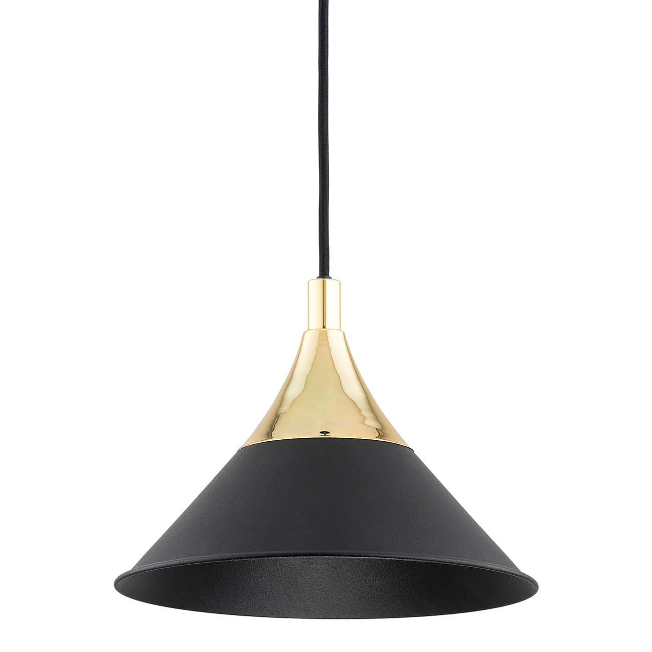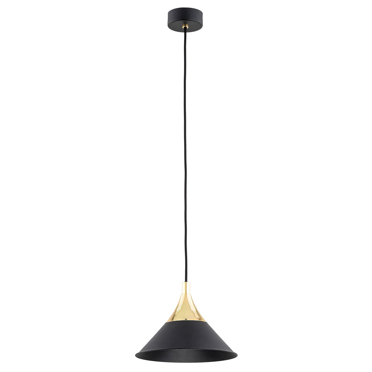 Prosta lampa wisząca ze stożkowym kloszem ze stali w kolorze czarnym i drobnymi złotymi akcentami. Lampa MASSETO to idealna metalowa lampa do kuchni lub salonu. Ta lampa wisząca pochodzi z polskiej manufaktury oświetlenia ARGON.