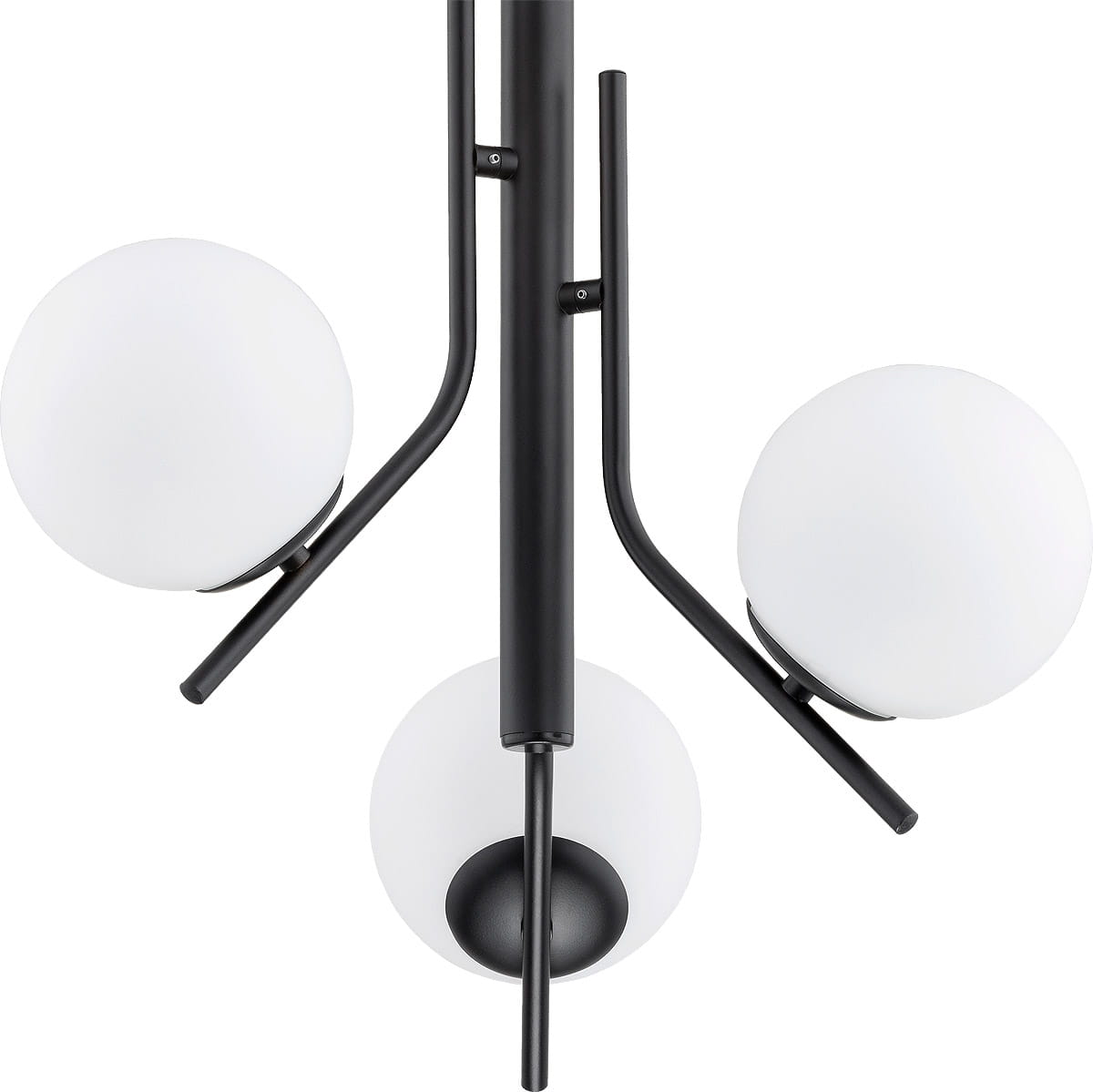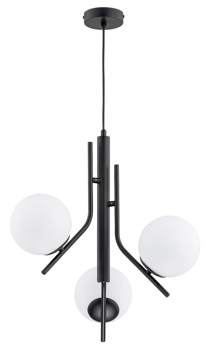 - Konstrukcja: Lampa składa się z trzech ramion zakończonych szklanymi kloszami w kształcie kulki, w białym kolorze. Klosze te nadają światłu delikatny, przytulny odcień, tworząc przyjemną atmosferę.