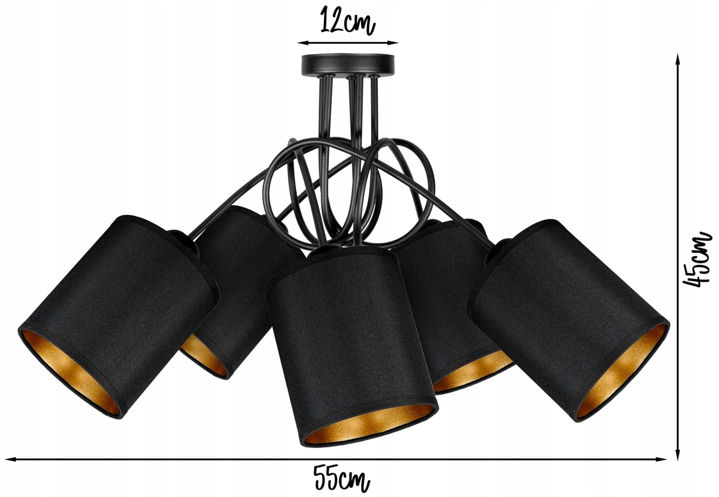 Żyrandol na 5 czarnych abażurów ze złotymi środkami świetnie sprawdzi się w połączeniu z innymi lampami z tej samej serii oraz niezależnie jako oświetlenie mieszkania.