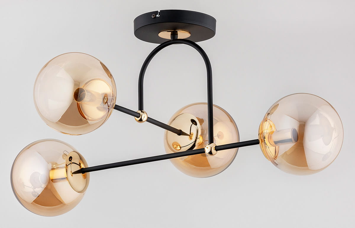 - Klosze: Każde z ramion zakończone jest szklanym kloszem w kolorze bursztynowym (Amber), który nadaje światłu ciepły, przytulny odcień, tworząc przyjemną atmosferę.