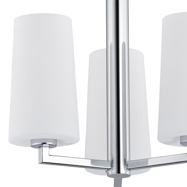 Klosze żyrandola Camelot są w kolorze białym, a chromowany stelaż nadaje mu unikalnego wdzięku.